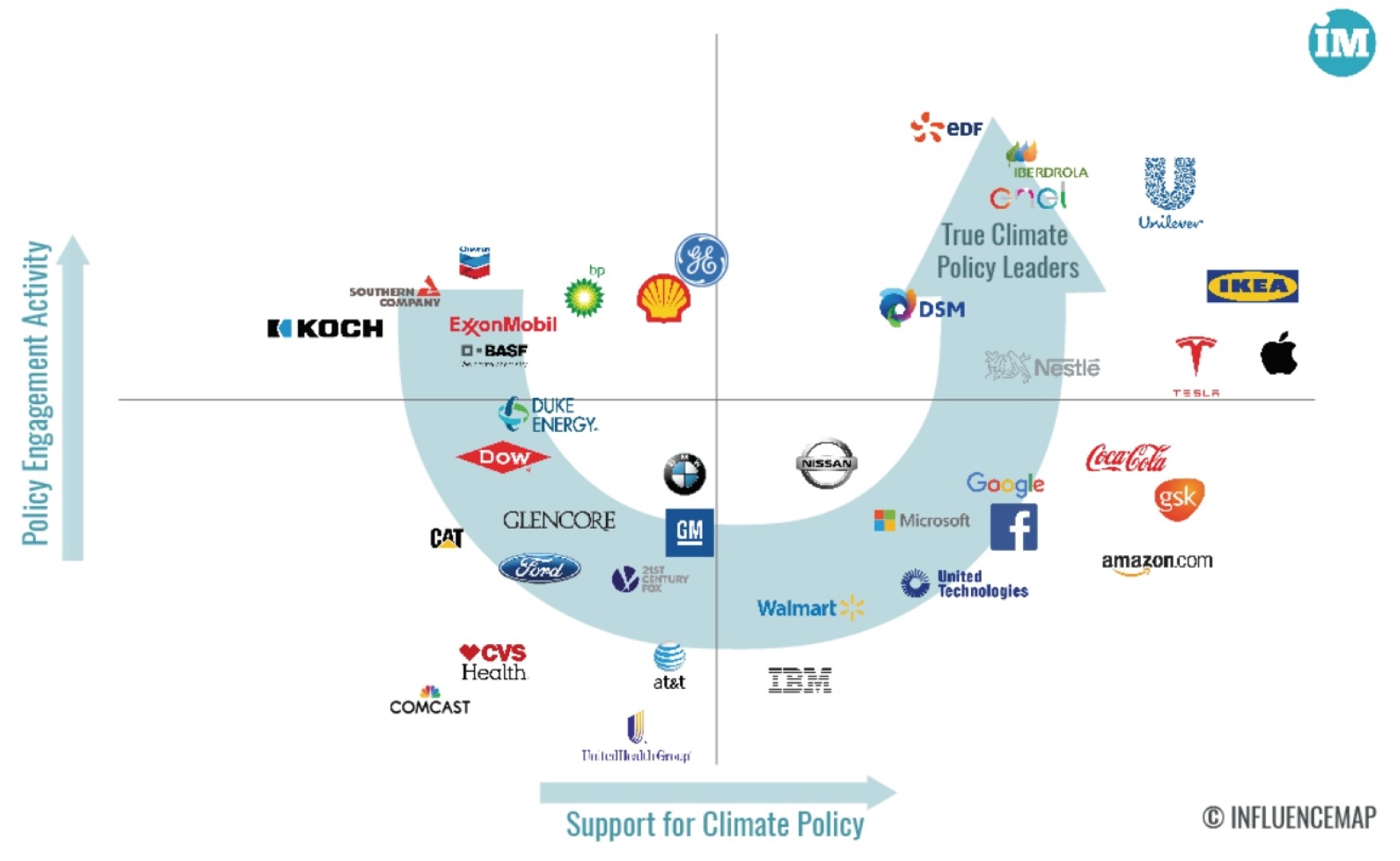 E veniamo allora al secondo report, “Corporate Carbon Policy Footprint” realizzato dall’inglese InfluenceMap, il quale classifica le maggiori società mondiali in funzione della loro capacità di influenzare ed orientare le politiche su energia e clima.