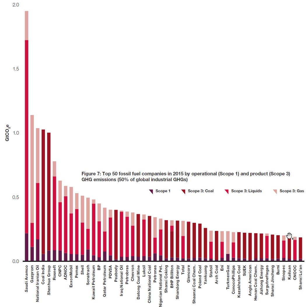 Ultimo dato: nell'anno 2015 le 224 aziende collegate al mondo delle energie fossili hanno determinato il 91% delle emissioni di gas serra industriali, ed oltre il 70% di tutte le emissioni antropogeniche globali.