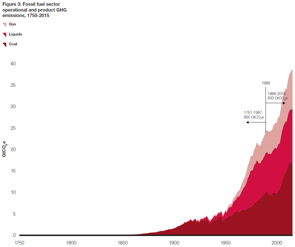 Il primo, “The Carbon Majors Database” del CDP e del Climate accountability institute (Cai), mostra come le prime 100 aziende produttrici di combustibili fossili abbiano storicamente concorso a generare una emissione complessiva in atmosfera per circa 1.000 miliardi di t di CO2 e gas serra, pari al 52% di tutta la CO2 emessa dagli inizi della rivoluzione industriale (anno 1750).