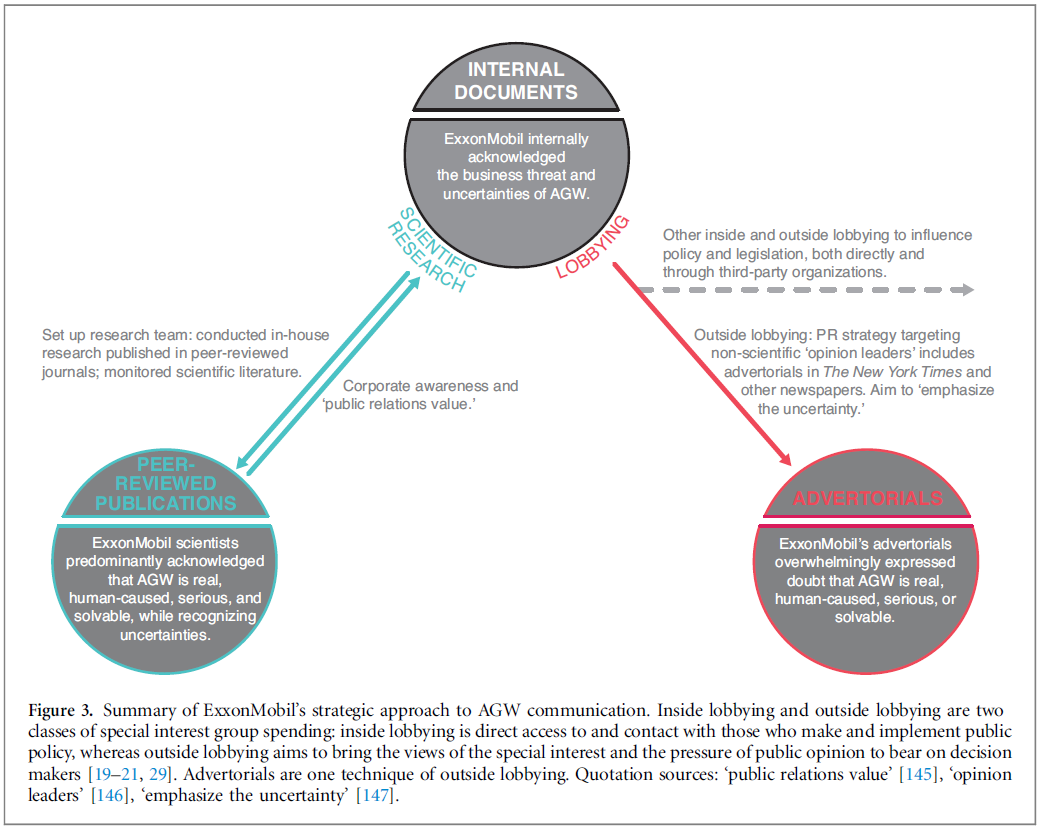 Chiudiamo con il terzo articolo, “Assessing ExxonMobil’s climate change communications (1977–2014)” realizzato da ricercatori dell’Università di Harvard e Cambridge, che analizza lo storico impegno della più grande azienda petrolifera mondiale (quale, appunto, Exxon Mobil) nella disinformazione e nel negazionismo climatico, una azione intrapresa con il chiaro scopo di ritardare e togliere consenso alla legislazione sul clima, a vantaggio delle proprie attività economiche.