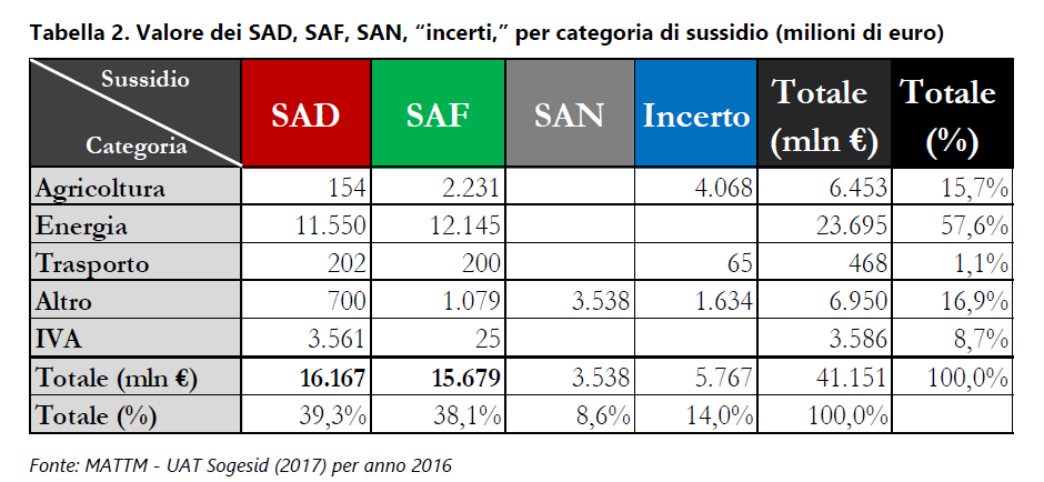 Il sopraddetto Catalogo ha individuato 57 forme di sussidio dannoso per l’ambiente (SAD, al costo -appunto- di 16,2 miliardi di euro) a fronte di 46 forme di sussidio favorevole all’ambiente (SAF) per un controvalore pari a 15,7 miliardi di euro.