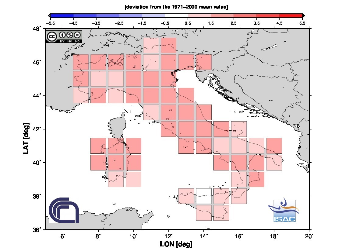 Infatti, secondo i dati dell’Istituto di Scienze dell’Atmosfera e del Clima del Consiglio nazionale delle ricerche (Isac-CNR), l’anomalia climatica italiana nel 2018 è stata di +1,58 °C oltre la media rispetto al periodo di riferimento 1971-2000, superando quindi anche il precedente record registrato nel 2015 (con +1,44 °C oltre la media).