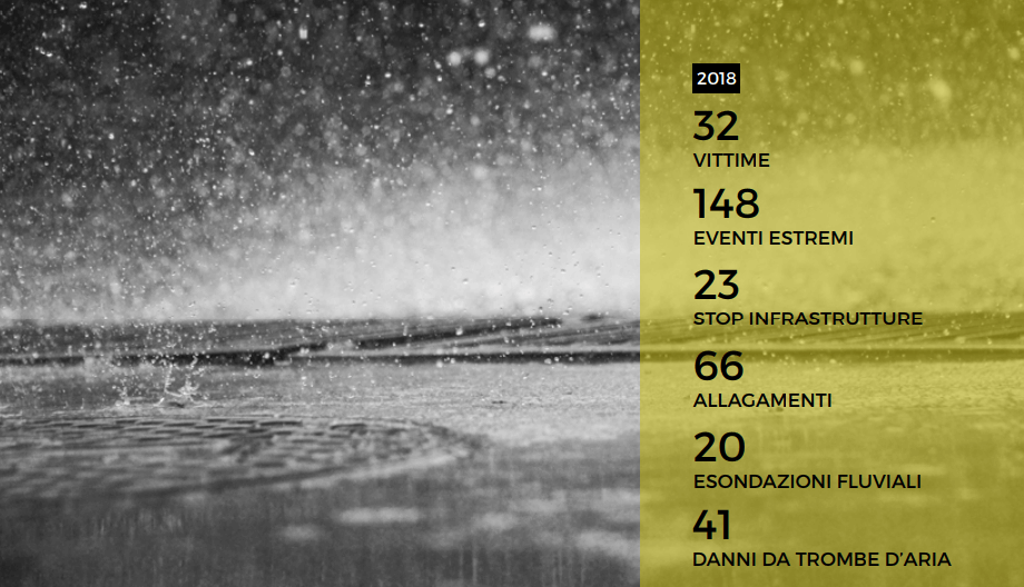 Nel solo 2018 il report di Legambiente registra 148 eventi meteorologici estremi in Italia, con numerose vittime: si contano 66 casi di danni da allagamenti collegati a piogge intense, 41 casi di danni da trombe d’aria, 23 di danni alle infrastrutture e 20 esondazioni fluviali.