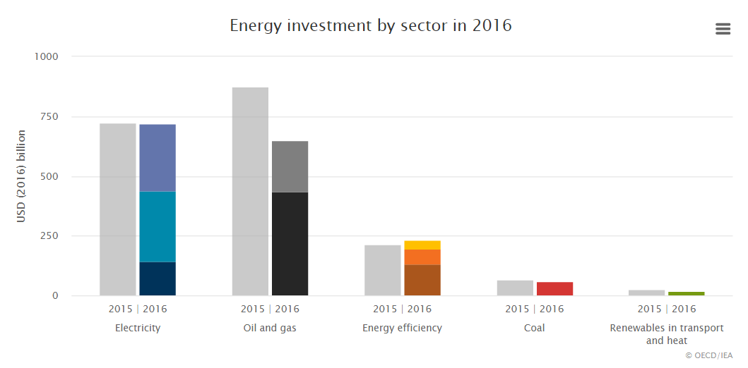 In questo quadro complessivo è da sottolineare la notizia di questi giorni riguardo allo storico sorpasso degli investimenti nel settore elettrico rispetto che nel settore oil&gas. Il dato è indicato nel World Energy Investment 2017 della IEA (International Energy Agency), che nel 2016 registra un calo generale degli investimenti mondiali in campo energetico (- 1.700 miliardi di $ nel 2016, il 12% in meno rispetto all’anno precedente) ma anche un ammontare globale di nuovi investimenti nel settore oil&gas pari a 649 miliardi di dollari (nel 2015 erano stati 873 miliardi gli investimenti nel settore) che sono stati però superati dagli investimenti nel settore elettrico (produzione e distribuzione) pari nel 2016 a 718 miliardi di dollari (di cui la maggior parte attirati dalle fonti rinnovabili).