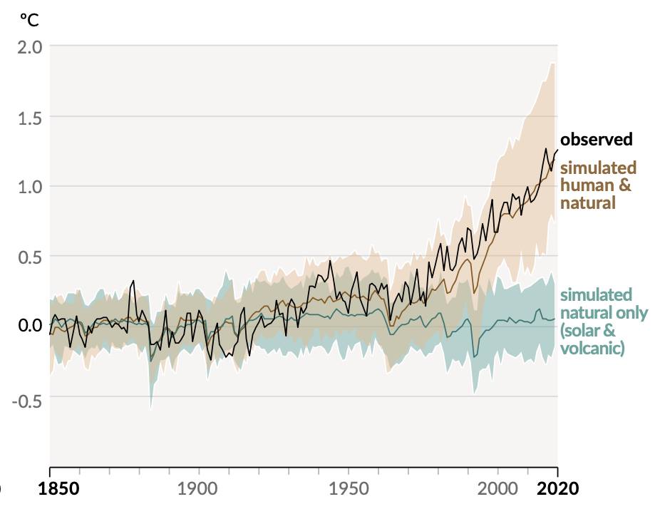 Descrivendo il grafico, la curva di colore nero mostra l'andamento delle temperature misurate dal 1850 a oggi, in arancione viene indicata la variabilità delle temperature che ci saremmo aspettati considerando l'attività umana, in verde la variabilità delle temperature che si sarebbero verificate senza contributo umano (cioè considerando i soli fattori naturali, some il Sole e attività vulcanica).