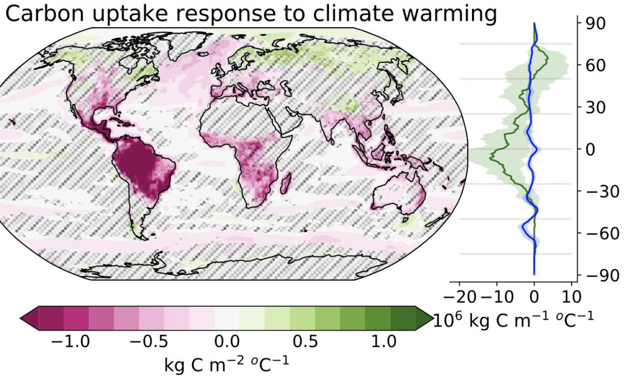 Un dato però altrettanto fortemente preoccupante sono le previsioni relative alla riduzione della capacità di assorbimento di CO2 da parte di foreste ed oceani, ecosistemi che hanno mitigato il riscaldamento climatico avendo ad oggi assorbito più di metà delle emissioni umane di gas serra. Secondo il report Ipcc, infatti, questi sistemi rischiano di rallentare in maniera significativa la loro capacità di assorbimento (in viola nella cartina a seguito), non supportando più l'uomo nel contrasto al climate change: