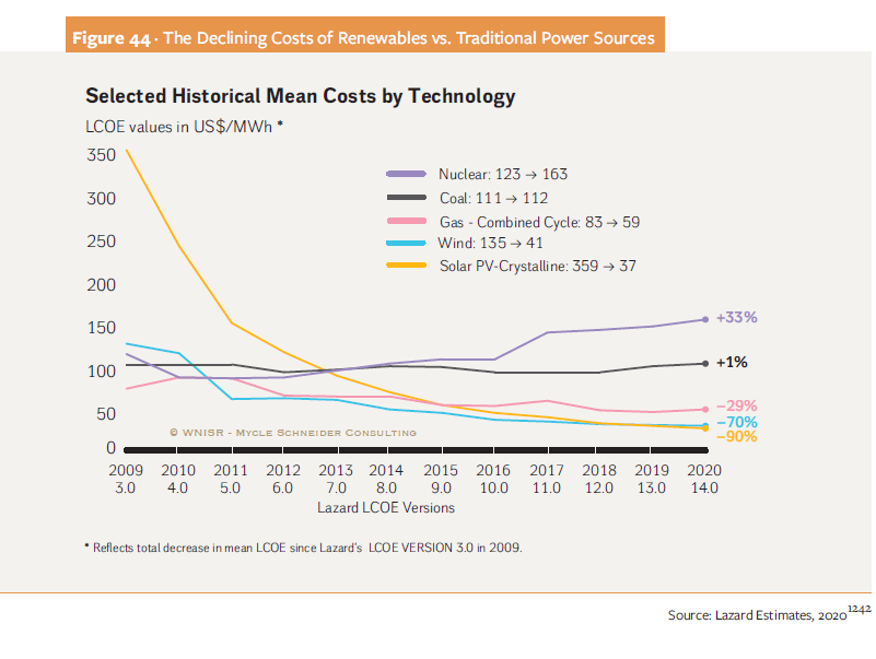 Il capitolo finale della pubblicazione offre un paragone impietoso tra nucleare e rinnovabili da un punto di vista economico.