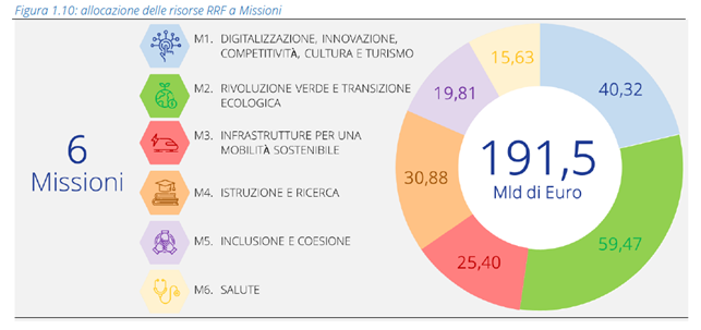 Per ricevere la propria parte di fondi pubblici previsti dall’NGEU, ogni Stato Membro ha dovuto elaborare un “Piano Nazionale di Ripresa e Resilienza” (PNRR), sottoponendolo ad approvazione da parte di Bruxelles. L’Italia è lo Stato che ha ricevuto la quota maggiore di aiuti: 191,5 miliardi di euro, cui si devono aggiungere altri fondi nazionali e comunitari, per un totale di circa 235 miliardi di euro.