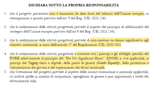 In linea con le regole del Recovery Fund, il PNRR prevede che tutti gli interventi, pena l'inammissibilità, siano coerenti con il principio Do Not Significant Harm (DNSH), ossia del non arrecare nessun danno significativo all’ambiente, ai sensi della Tassonomia dell'UE.