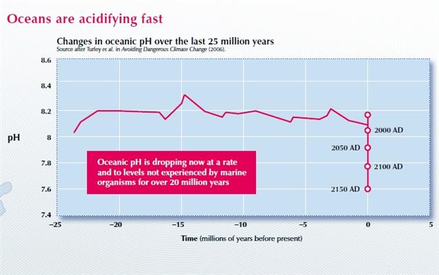 Secondo il rapporto: "L'acidificazione degli oceani avanza 10 volte più velocemente di quello a cui ha proceduto l'estinzione di un gran numero di specie marine 55 milioni di anni fa. Se si prosegue al ritmo attuale, ecosistemi fragili come le barriere coralline, che ospitano una grande ricchezza biologica, saranno gravemente colpiti entro il 2050".