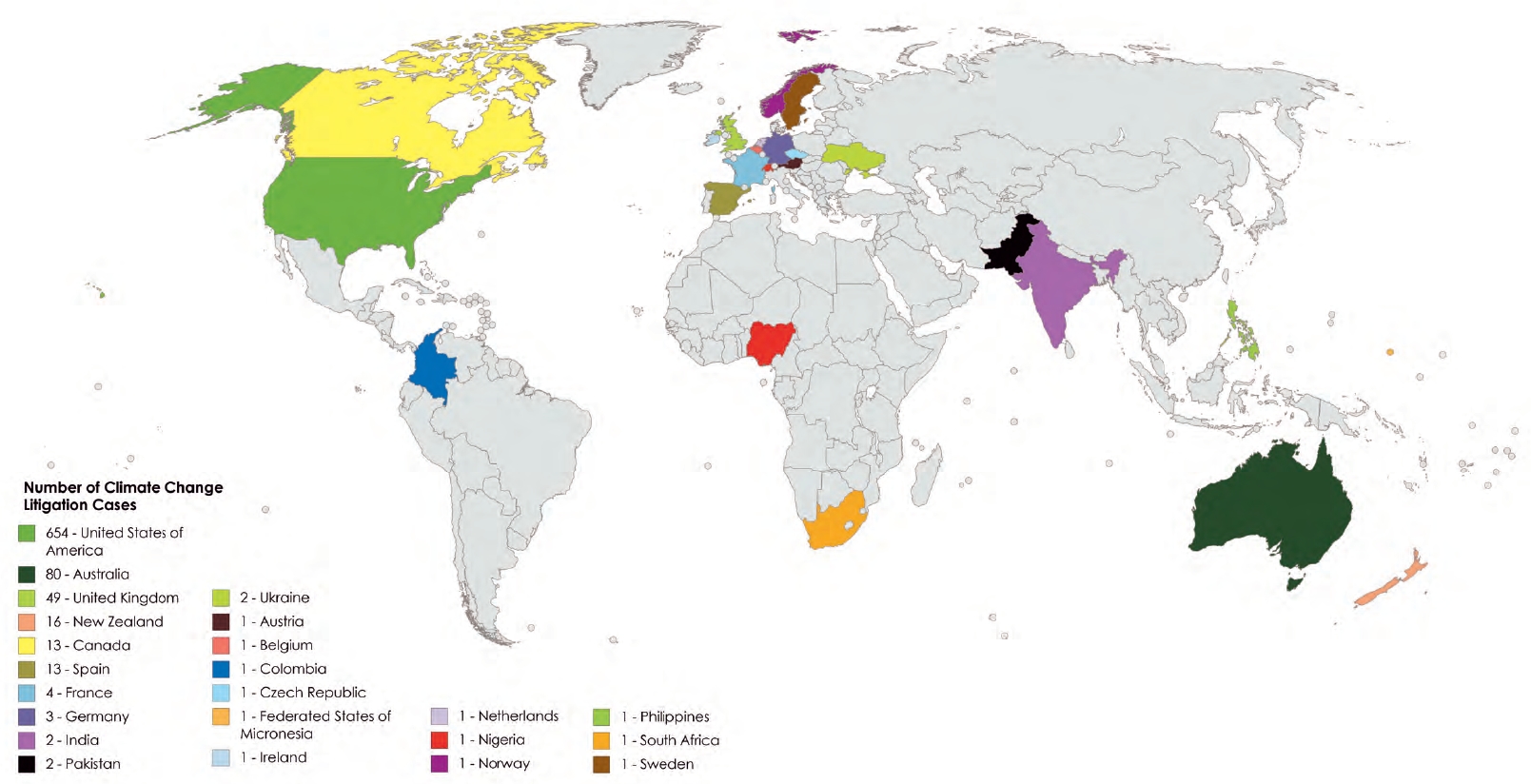 Dal report: “Fino a marzo 2017 sono state avviate cause legali legate cambiamento climatico in 25 stati del mondo, con 654 cause avviate nei soli USA e 230 cause avviate in tutte le altre nazioni”.