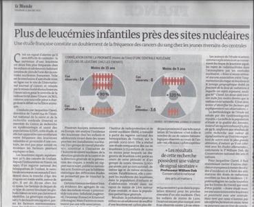 Un gruppo di ricercatori francesi dell'Inserm (Institut National de la Santé et de la Recherche Médicale) e dell’Irsn (Institut de Radioprotection et de Sûreté Nucléaire) ha recentemente realizzato la ricerca "Childhood leukemia around French nuclear power plants - the Geocap study, 2002-2007", pubblicata sulla rivista International Journal of Cancer (di cui segnaliamo le anticipazioni pubblicate da Reuters e il link alla notizia pubblicata su Le Monde, da cui è estratta l'immagine qui a fianco).