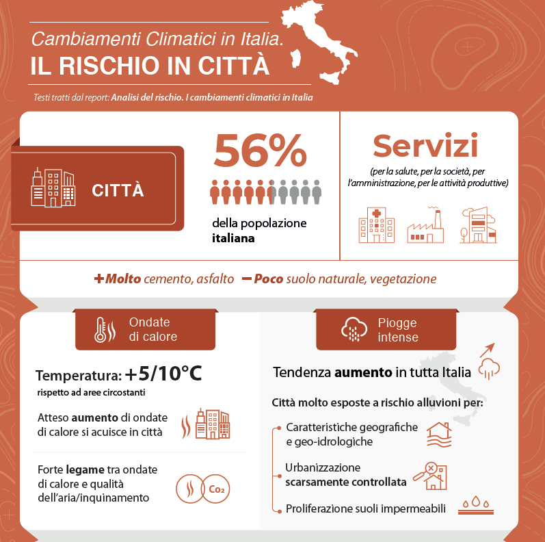 La probabilità di eventi climatici estremi non è soltanto una minaccia futura: negli ultimi 20 anni il rischio in Italia è cresciuto del 9% e le zone urbane, dove si concentra oltre il 56% della popolazione italiana, sembrano essere le più vulnerabili.