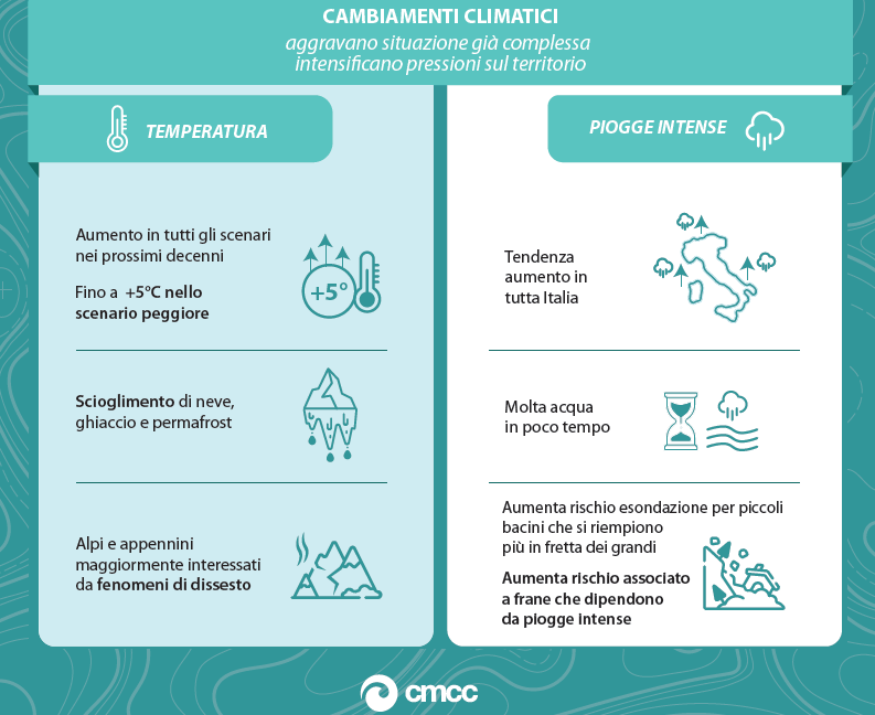 Come tutti tristemente sappiamo, l’Italia è un Paese ad alto rischio idro-geologico. Secondo lo studio del Cmcc, è atteso "l’aggravarsi di una situazione di per sé molto complessa”, sia nelle zone alpine e appenniniche, le più interessate da fenomeni di dissesto legati allo scioglimento di neve e ghiacci, sia nei piccoli bacini e nelle aree a forte pericolo di frane, a causa soprattutto delle precipitazioni intense.