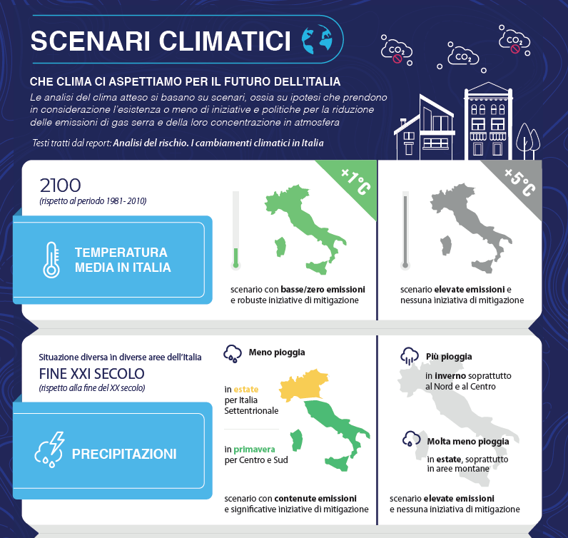 Gli scenari climatici presentati nel report forniscono informazioni sul clima futuro atteso in Italia a seconda di come e quando verranno adottate politiche per la riduzione delle emissioni di gas serra in atmosfera.