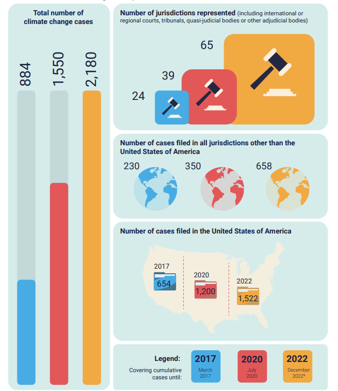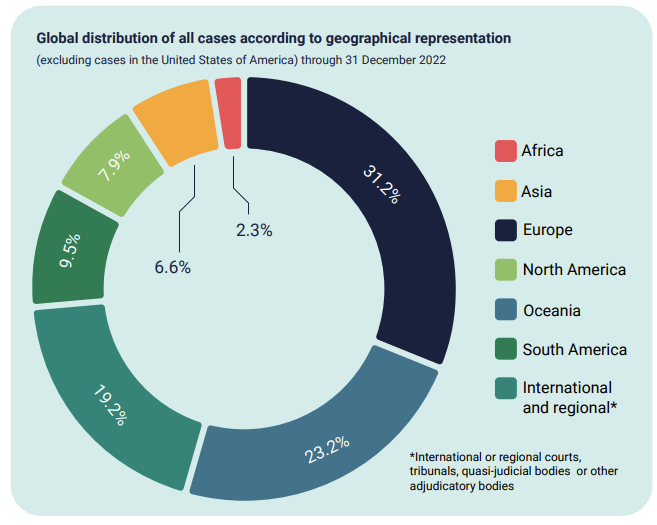Al 31 dicembre 2022, come indicato dal Global Litigation Report dell'UNEP, sono stati riportati più di duemila casi presentati in 65 giurisdizioni diverse.