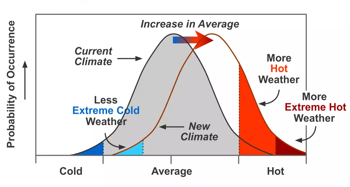 Come si può vedere in figura, anche un piccolo aumento delle temperature medie comporta una maggiore incidenza di estremi di caldo.