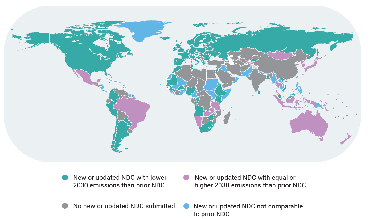 Finora circa 120 paesi hanno presentato NDCs rivisti, ma alcuni dei principali emettitori (come Cina, India, Turchia, Arabia Saudita) non lo hanno ancora fatto.