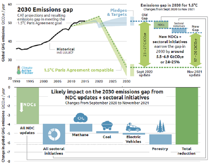 Il testo finale rileva che gli attuali piani climatici nazionali, i cosiddetti NDCs (Nationally Determined Contributions), sono lontani da ciò che è necessario per contenere la temperatura a +1,5°C: a tal fine, si chiede ai paesi di presentare nuovi piani aggiornati già l'anno prossimo alla COP27, anziché tra altri cinque anni, come era previsto dall’Accordo di Parigi.