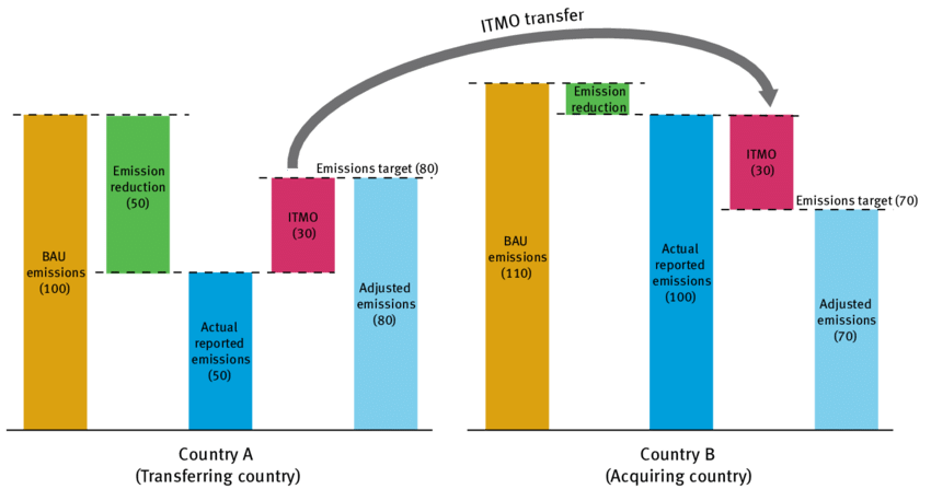 Il primo meccanismo permetterebbe a un paese che ha superato il suo target relativo alle emissioni di vendere qualsiasi risultato in eccesso a una nazione che non abbia raggiunto i suoi obiettivi. Tali risultati sono denominati ITMO (“Internationally transferred mitigation outcomes”).