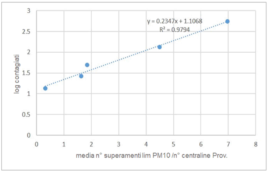 Tale analisi sembra indicare una relazione diretta tra il numero di casi di COVID-19 e lo stato di inquinamento da PM10 dei territori, coerentemente con quanto ormai ben descritto dalla più recente letteratura scientifica per altre infezioni virali: in pratica, quanto più viene superato il limite di PM10 più i casi di COVID-19 aumentano.