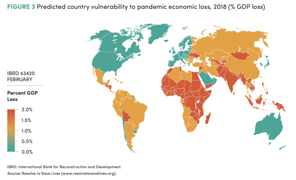 L'immagine a seguito mostra le possibili perdite % di PIL (rispetto ai valori 2018) a seguito di pandemia globale, così come previste nella ricerca "A World at risk" rilasciata dal Global Preparedness Monitoring Board nel settembre 2019 (scaricabile a seguito):