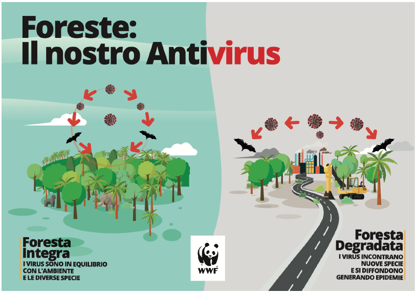 Un recente studio di WWF esplora le possibili relazioni tra le pandemie (come il coronavirus - SARS-CoV2) e le azioni di danneggiamento dell'uomo sull'ambiente, tra cui la distruzione e la modificazione degli ecosistemi dovuta alla penetrazione dell’uomo nelle ultime aree incontaminate del pianeta ed il commercio di animali selvatici vivi.