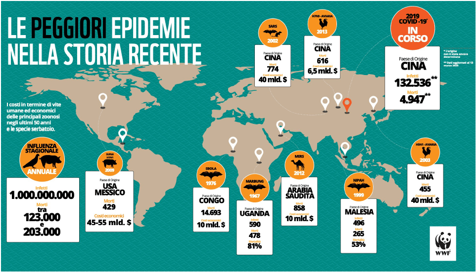 Se ancora non è chiara l’origine dell'attuale virus SARS-CoV2, la causa della malattia da coronavirus nel 2019 (COVID-19), è probabile che questa sia collegata al commercio (legale e illegale) di animali selvatici vivi o di loro parti: questa pratica è fonte assodata di storiche zoonosi, che ogni anno causano circa un miliardo di malati e milioni di morti.