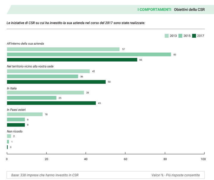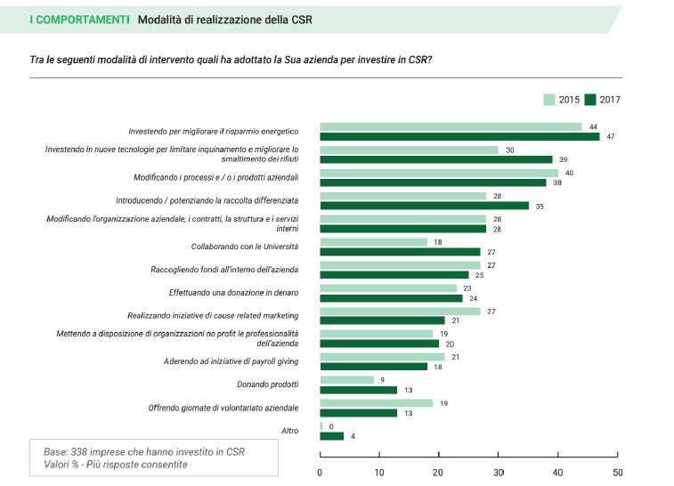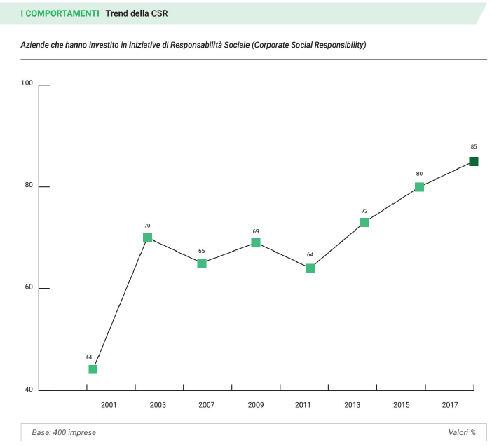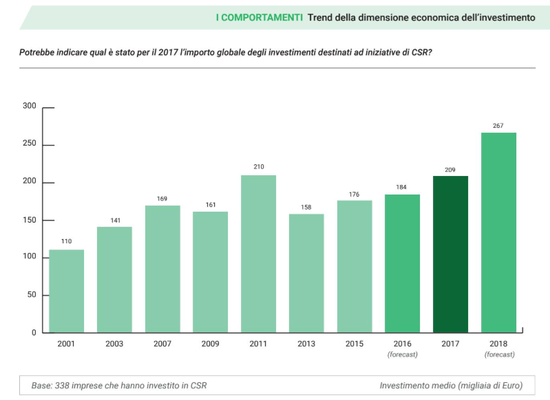 Secondo il report, nel 2017 si è registrato quasi un miliardo e mezzo di euro (1,412 mld) investiti in azioni di CSR da parte delle aziende italiane, pari al 25% in più rispetto al dato del 2015 (1,122 mld): significativo il dato circa la percentuale delle Aziende che credono nella CSR, passata dal 44% circa nel 2001 all'85% nel 2017.