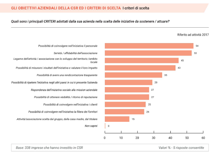 Risulta primario anche il coinvolgimento dei dipendenti, la serità e credibilità del partner, la misurabilità delle azioni, la trasparenza nella rendicontazione degli investimenti.