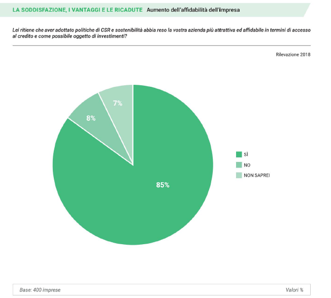 Il 97% delle Aziende che fanno attività di CSR si dichiara soddisfatto, mentre l’85% ritiene che le politiche di CSR rendano l’impresa “più attrattiva e affidabile in termini di accesso al credito e come possibile oggetto di investimenti”.