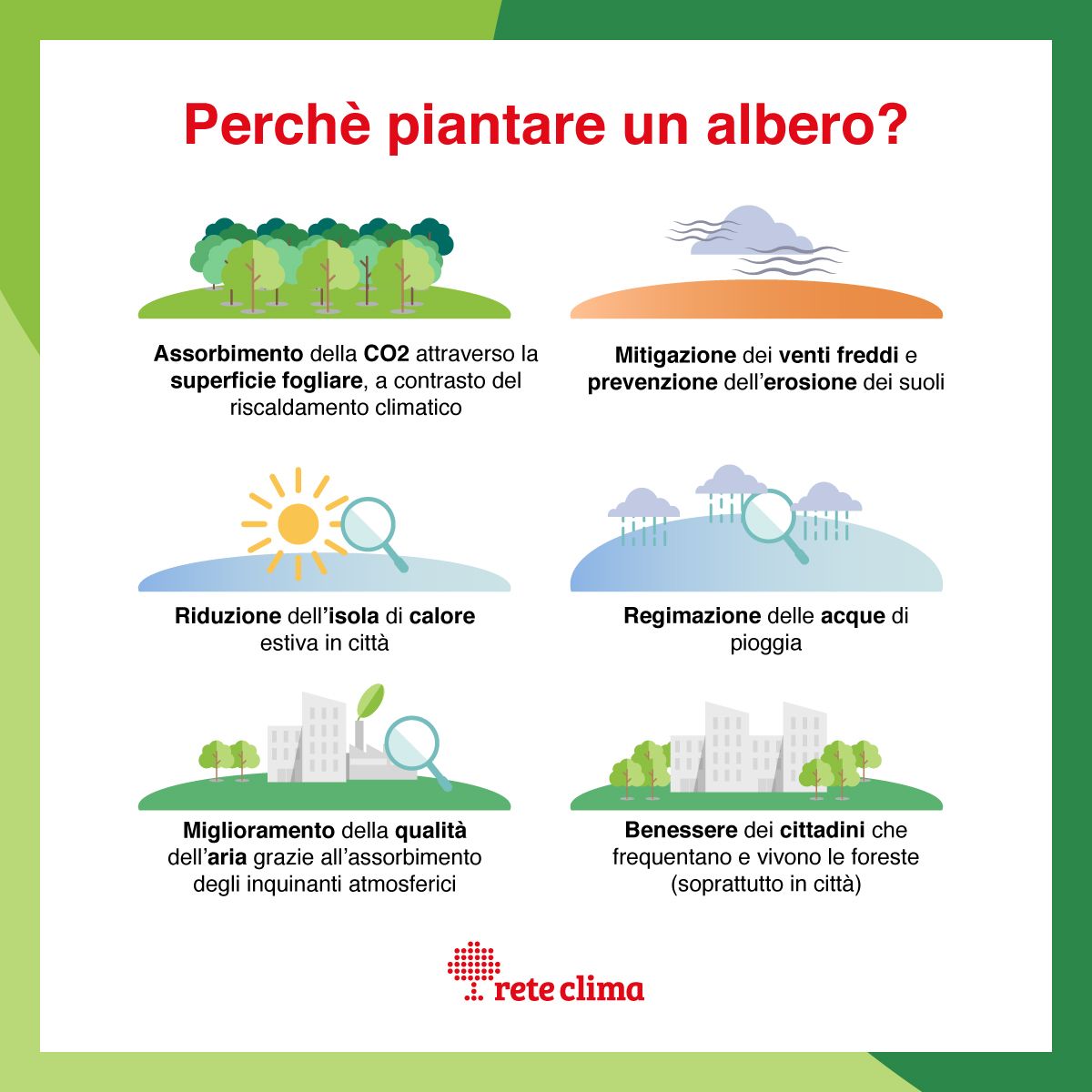 Una possibile soluzione a questo problema, che è riconosciuta come valido strumento sia di mitigazione che di adattamento dagli scienziati dell’IPCC ed è prevista in piani europei (Green Deal) e nazionali (PNRR), è la forestazione urbana e periurbana. La vegetazione riesce infatti a rinfrescare le aree urbanizzate grazie all’ombreggiamento e al processo di evotraspirazione.