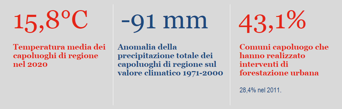 Nel 2020, nei capoluoghi di regione italiani, la temperatura media annua ha presentato un’anomalia di +1,2°C rispetto al trentennio 1971-2000. Allo stesso tempo, si è registrato un calo delle precipitazioni pari in media a -91 mm di pioggia. La buona notizia è che si è avuto un notevole incremento della forestazione urbana.