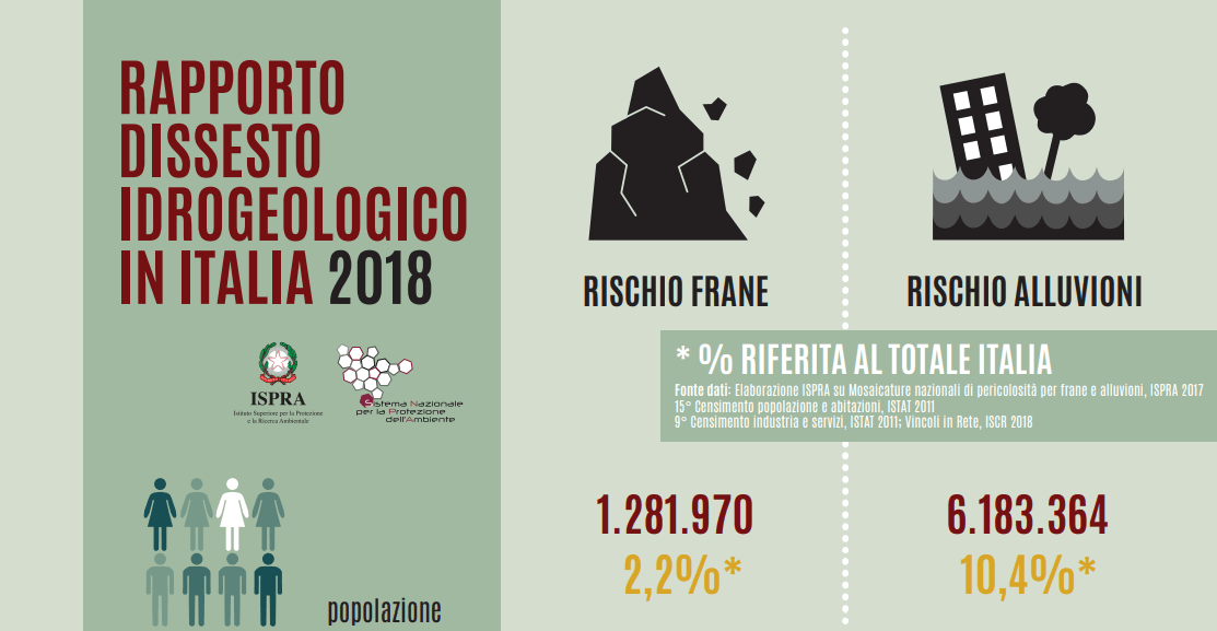 ISPRA (Istituto Superiore per la Protezione e la Ricerca Ambientale) ha rilasciato il Rapporto 278/2018 "Dissesto idrogeologico in Italia: pericolosità e indicatori di rischio" (Edizione 2018), il secondo rapporto sul dissesto idrogeologico in Italia che fornisce il quadro di riferimento aggiornato sulla pericolosità per frane e alluvioni sull’intero territorio nazionale e presenta gli indicatori di rischio relativi a popolazione, famiglie, edifici, imprese e beni culturali.