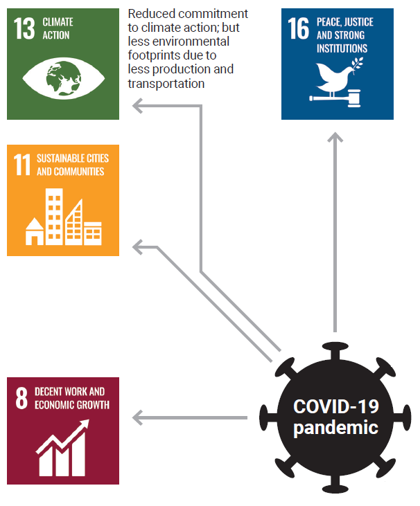 Questa situazione socio-economica di grave crisi generata dal COVID-19 potrà avere un effetto negativo anche sul raggiungimento degli Obiettivi di Sviluppo Sostenibile (SDGs - Sustainable Development Goals): la crisi potrà incidere in maniera negativa peraltro non solo sull'attuazione dell'Agenda per lo Sviluppo sostenibile delle Nazioni Unite al 2030 (da cui appunto emergono i sopraccitati SDGs), ma anche sull'Accordo di Parigi rivolto al contrasto al riscaldamento climatico.
