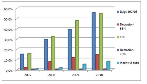 Sono interessanti anche i dati legati alla valutazione dei risparmi energetici conseguiti a livello regionale con l’attuazione delle principali misure nazionali di incentivazione: per il triennio 2007-2009 è stato evidenziato il ruolo primario di Lombardia, Veneto, Piemonte ed Emilia-Romagna rispetto a tutte le altre Regioni Italiane, sia in riferimento agli interventi di efficientamento, sia in riferimento al contenimento dei consumi mediate loro razionalizzazione.