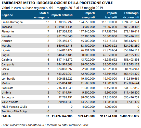 Secondo i dati raccolti da Ref Ricerche e pubblicate nel suo recente report Dall’emergenza alla prevenzione: urge un cambio di paradigma (download a seguito) nei soli ultimi sei anni (dal maggio 2013 - maggio 2019) in Italia sono stati dichiarati 87 stati d’emergenza a seguito di situazioni di siccità, alluvioni e frane, con danni per 9,4 miliardi di euro (accertati dai Commissari): a questi danni economici si aggiungono peraltro le numerose vittime, 32 nel solo 2018.
