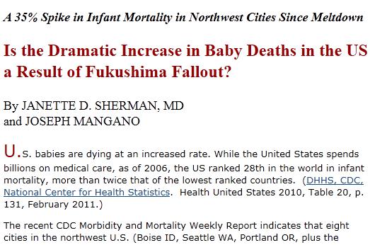 Nell’articolo si riportano i dati del Centre of Disease Control di Atlanta, secondo cui nel periodo Marzo-Maggio 2011 è stato rilevato un aumento del 35% della mortalità infantile neonatale in otto città del nordovest degli Stati Uniti (tra cui Seattle, Portland e San Francisco).