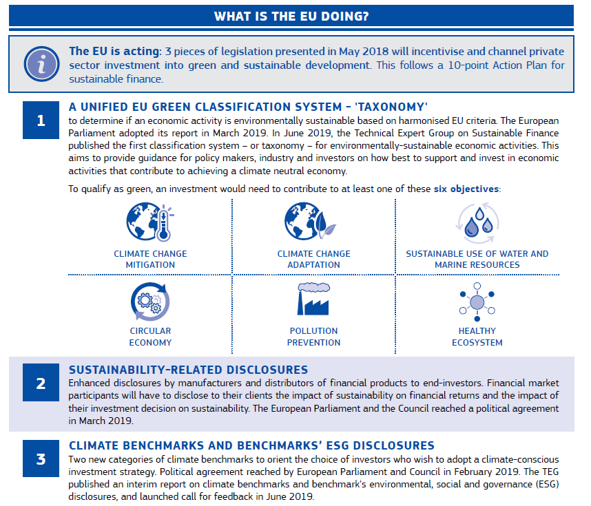 Tramite questo intricato puzzle di norme e provvedimenti, la Commissione Europea intende promuovere gli investimenti privati sostenibili: raccogliere fondi per il Green Deal europeo, per un valore stimato pari a 170 - 290 miliardi di euro all’anno in più rispetto ai finanziamenti pubblici.
