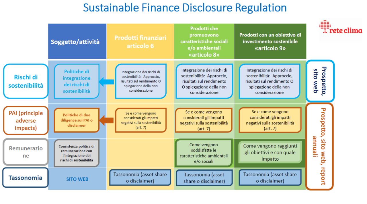 Più in dettaglio, gli obblighi previsti dall’SFDR sono differenziati con riguardo sia all’oggetto di riferimento dell’informativa (informazioni riferite ai partecipanti ai mercati finanziari e ai consulenti – “entity level” – oppure al prodotto finanziario – “product level”), sia alla modalità di fornitura dell’informativa stessa (sito web, informativa precontrattuale o informativa periodica).