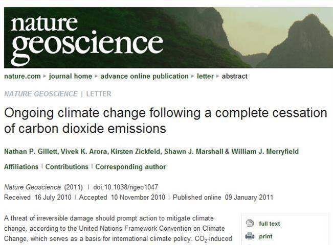 Secondo lo studio "Ongoing climate change following a complete cessation of carbon dioxide emissions" pubblicato su Nature Geoscience: “Il riscaldamento climatico proseguirà fino all'anno 3000 anche se tutte le emissioni di gas serra saranno vietate entro il 2100” mente gli emisferi Nord e Sud del pianeta “Sono diversamente recettivi al riscaldamento climatico”.