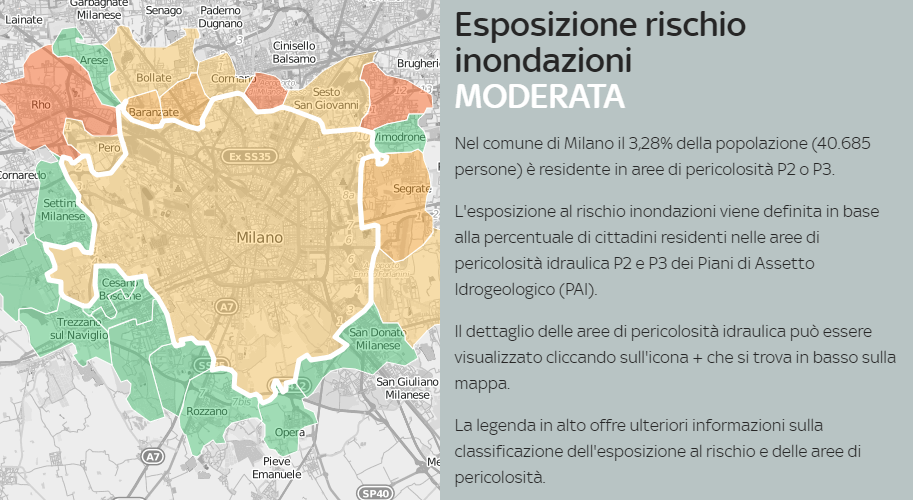 Da una ricerca sulla città di Milano si scopre, per esempio, che il rischio di inondazioni è moderato dato che solo il 3,28% delle persone vive in zona a rischio, mentre non sono significativi altri rischi di frana, terremoto ed eruzioni.