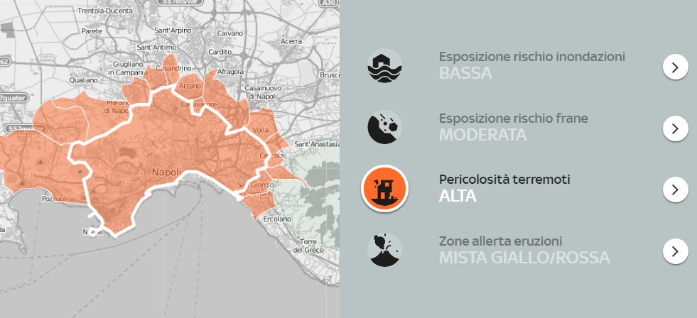 Osservando la restituzione del tool in merito ai rischi a Napoli si verifica invece, per esempio, che il suo territorio comprende zone di pericolosità sismica di classe 2 (alta), mentre che che l'esposizione a rischio frane è moderata dato che solo 4,78% della popolazione (45.943 persone) è residente in aree di pericolosità P3 o P4.