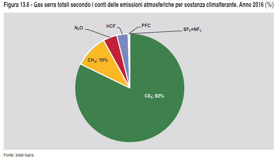 Nella composizione delle emissioni di gas serra, l’elemento predominante è l’anidride carbonica (CO2), che incide per più dell’80%; il metano (CH4) contribuisce per il 10%; il protossido di azoto (N2O) è presente per circa il 4%; gli idrofluorocarburi per circa il 3%. In minima parte sono presenti i perfluorocarburi (0,4%) e gli esafluoruri e trifluoro di azoto (0,1%):