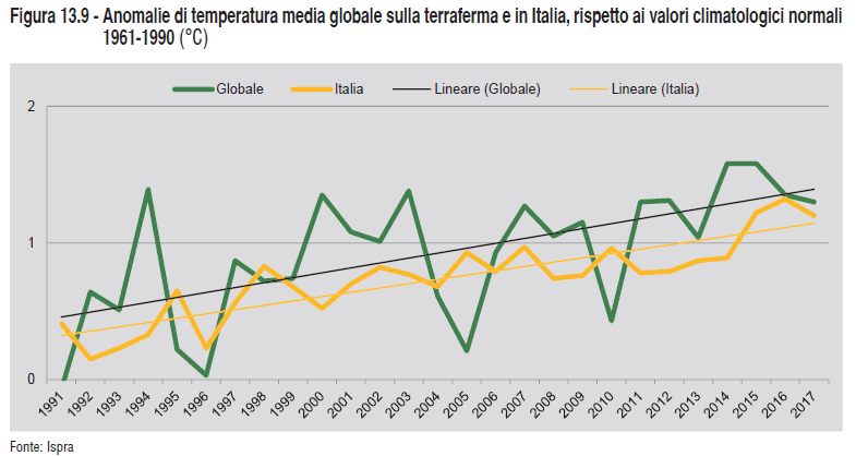 Le anomalie termiche sulla terraferma globali e in Italia si sono tradotte in un aumento pari, rispettivamente, a +1,20 e +1,30 °C rispetto ai valori climatologici normali (1961-1990):