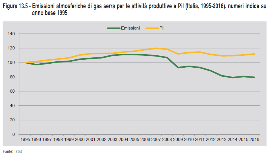 Rispetto alle emissioni nazionali di gas ad effetto serra, si registra un disaccoppiamento tra PIL ed emissioni climalteranti, con un diminuzione di queste ultime rispetto all'andamento del PIL: