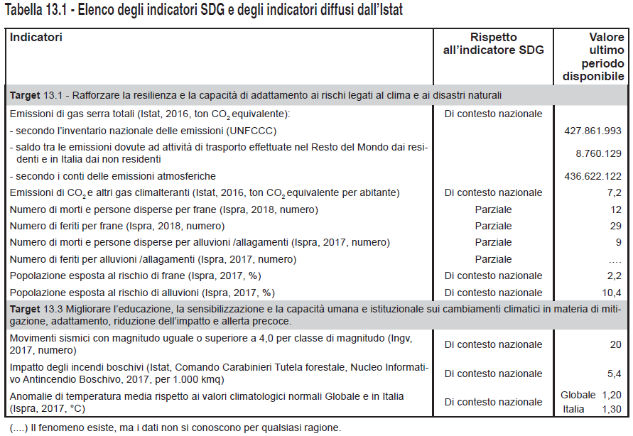 Rispetto all SDG 13 (contrasto al cambiamento climatico) in Italia si registra una intensificazione degli eventi calamitosi, anche a causa dei cambiamenti climatici, con avvenimenti disastrosi a cascata e multirischio: frane, alluvioni, incendi boschivi, nubifragi, fenomeni climatici estremi, ondate di calore, deficit idrici.