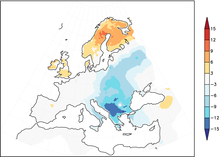 (scostamento dalle temperature medie diurne nei giorni 7-11 gennaio 2017 in Europa - fonte: KNMI/E-OBS)