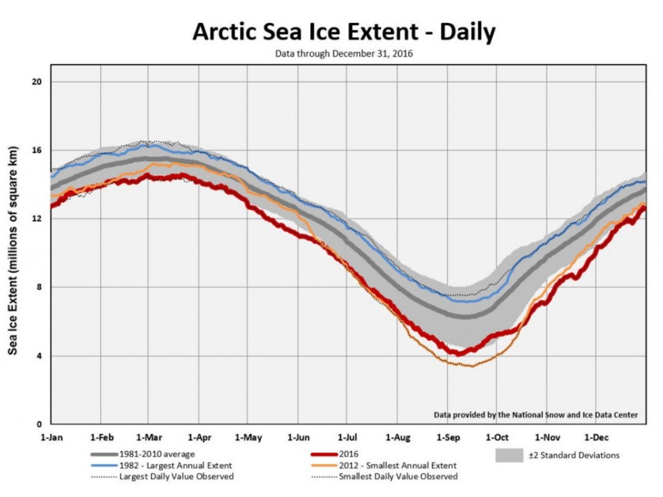 Nel caso delle abbondanti e localizzate nevicate dei giorni scorsi, una concausa può essere infatti identificata proprio nel riscaldamento climatico e nei suoi effetti sul sistema artico: l'artico è infatti da qualche anno soggetto ad un riscaldamento molto superiore rispetto ad altre zone del pianeta, con temperature in alcuni periodi assolutamente anomale (nel periodo di Capodanno 2016 si registravano al Polo Nord circa 35 °C oltre la media del periodo!) che determinano lo scioglimento di importanti porzioni della banchisa artica.