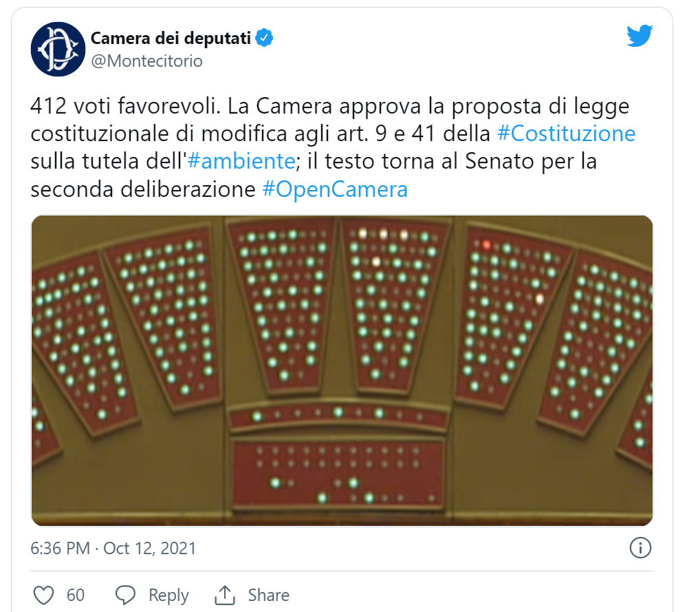La Camera ha approvato oggi in via definitiva la proposta di riforma costituzionale che inserisce nella Costituzione della Repubblica Italiana la tutela dell’ambiente e lo storico fondamentale principio di "giustizia intergenerazionale", già presente negli accordi storici sui temi della tutela ambientale oltre che - più recentemente - anche nel testo dell’Accordo di Parigi.